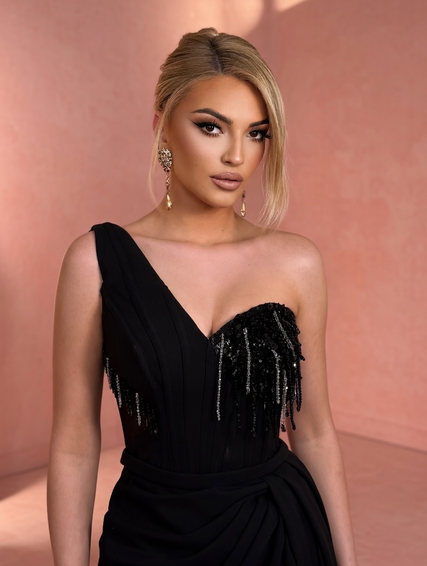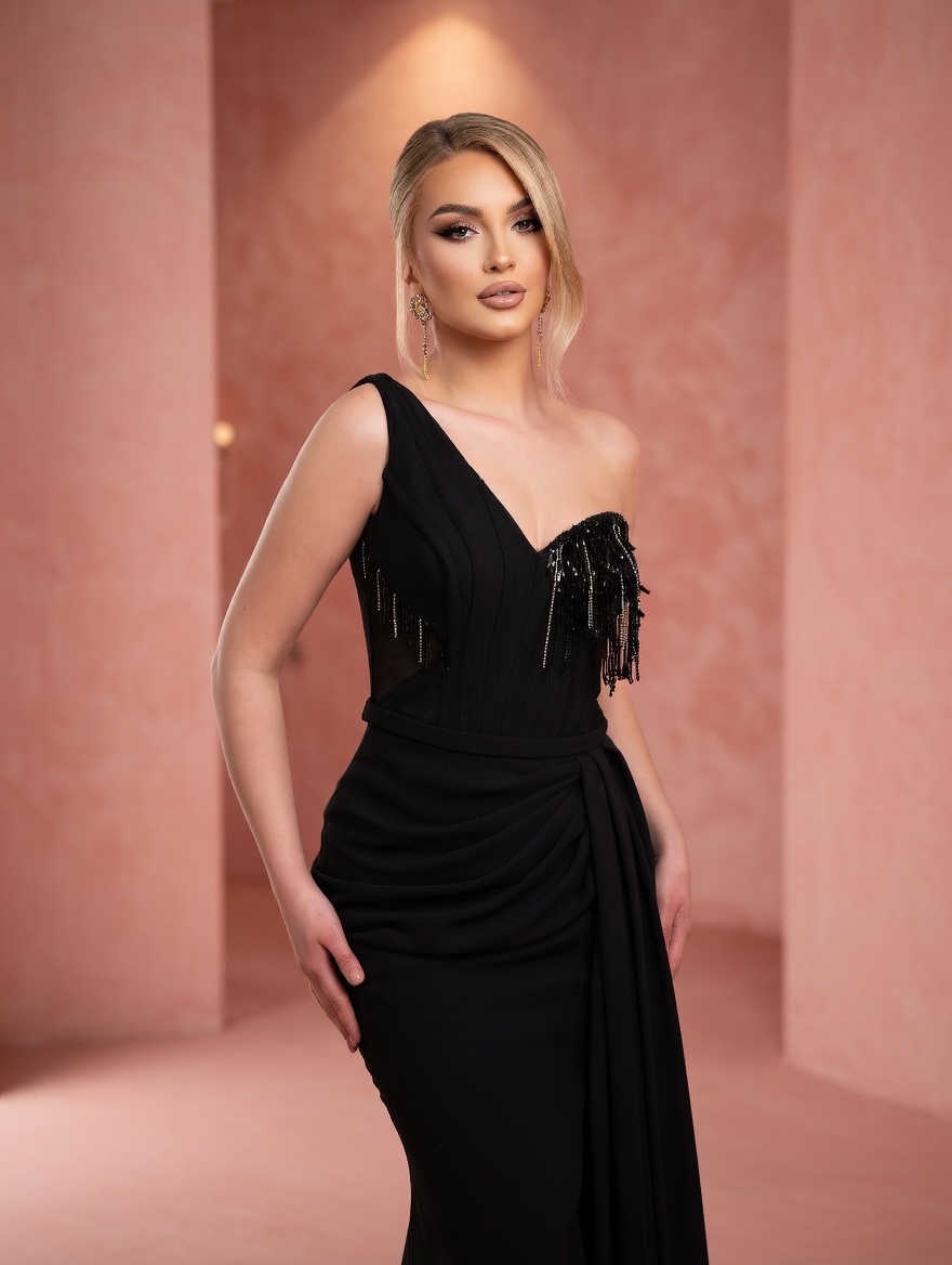 Deep chocolate brown — strapless lace column, corseted line, bead-trim neckline, evening-ready.